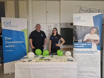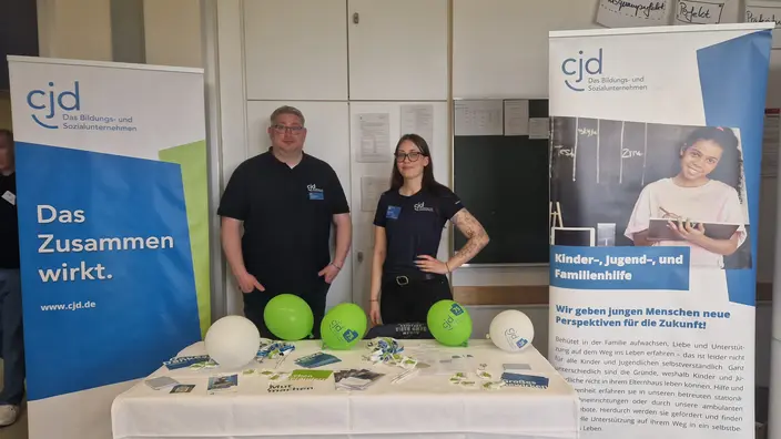 Zahlreiche Unternehmen, Institutionen und Bildungseinrichtungen aus der Region informierten über Ausbildungsberufe, Studienmöglichkeiten und verschiedene Karrierewege. Vorgestellt wurde insbesondere die praxisintegrierte Ausbildung zur staatlich anerkannten Erzieherin bzw. zum staatlich anerkannten Erzieher mit dem Schwerpunkt Jugend- und Heimerziehung. Viele Besucherinnen und Besucher nutzten die Gelegenheit, ins Gespräch zu kommen und konkrete Fragen rund um die Ausbildung zu klären. Vor Ort waren Thorsten Moritz, Angebotsleitung in Oberurff, sowie Elaine Kunigk, Kommunikatorin des Verbunds CJD Hessen. Die Ausbildungsmesse bietet jedes Jahr einen wertvollen Überblick über regionale Chancen, Ausbildungswege und Zukunftsperspektiven – da darf das CJD natürlich nicht fehlen!
