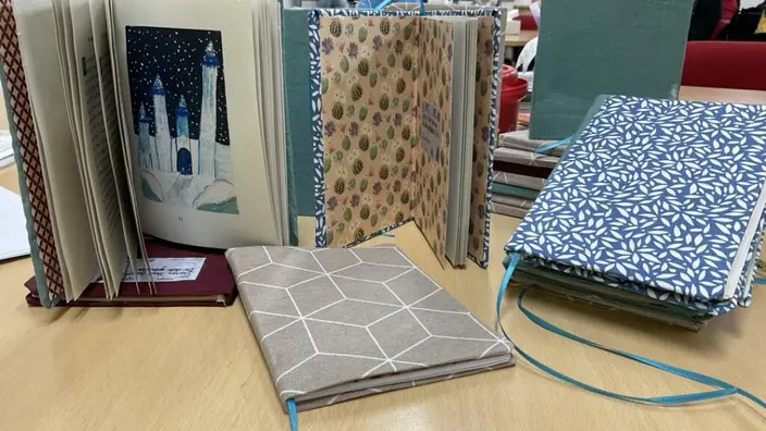 Als ersten Arbeitsschritt musste ein Stapel bedruckter Seiten ordentlich gefaltet werden. Danach wurden die Stapel zwischen Holzbretter geklemmt, damit die Seiten eng aufeinander lagen. Dann wurde jeder Stapel mit einer Klebebindung inklusive Heftgaze und Lesebändchen versehen. Am Ende dieser ersten Sitzung entstanden so mit viel Leimgepinsel die Innenteile der Bücher. Parallel hatten einige Schüler*innen einige bereits vorbereitete Innenteile mit Schmuckpapier versehen und in Bucheinbände geklebt. So konnten sie ihre Klassenkamerad*innen in der nächsten Bastelsession Tipps geben und weiterhelfen: Nach den Ferien wurden die Märchenbücher passend zur Zeugnisvergabe fertig gestellt: Die Klasse wählte aus unterschiedlichen (vorbereiteten) Stoffen den Bezug für den Umschlag. In drei Gruppen bezogen die Schüler*innen die Buchdeckel aus Pappe mit ihrem Buchstoff. Hier musste sorgfältig gearbeitet werden, damit der Stoff keine Blasen warf und gleichzeitig der Kleber nicht durchdrückte. In die vorbereiteten Umschläge wurde schließlich die Innenteile der Bücher eingeklebt. Die Zeit war vorangeschritten, aber die Schüler*innen arbeiteten zügig weiter, um die Bücher noch fertig zu stellen. Und das gelang: Am Ende der Doppelstunde stapelten sich die brandneuen Märchenbücher, jedes mit einem Aufkleber versehen, auf dem vermerkt war, wer für wen dieses kleine Kunstwerk geschaffen hatte.
